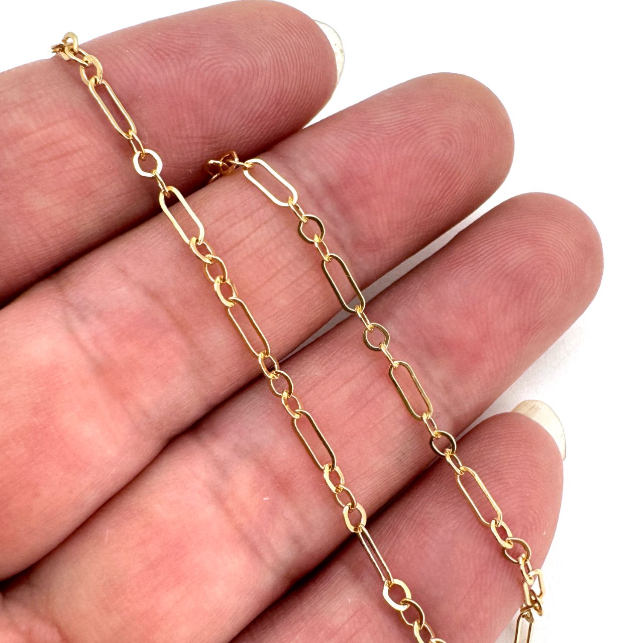 Custom wishlist OK Add to wishlist Add to compare list 1/20 14k Gold Filled Figaro 8 Cable Chain 4.3mm by 2.3mm (sold per foot) SKU : 101089GF 3.5mm by 2.3mm 12 links per inch From $13.24 Add to cart