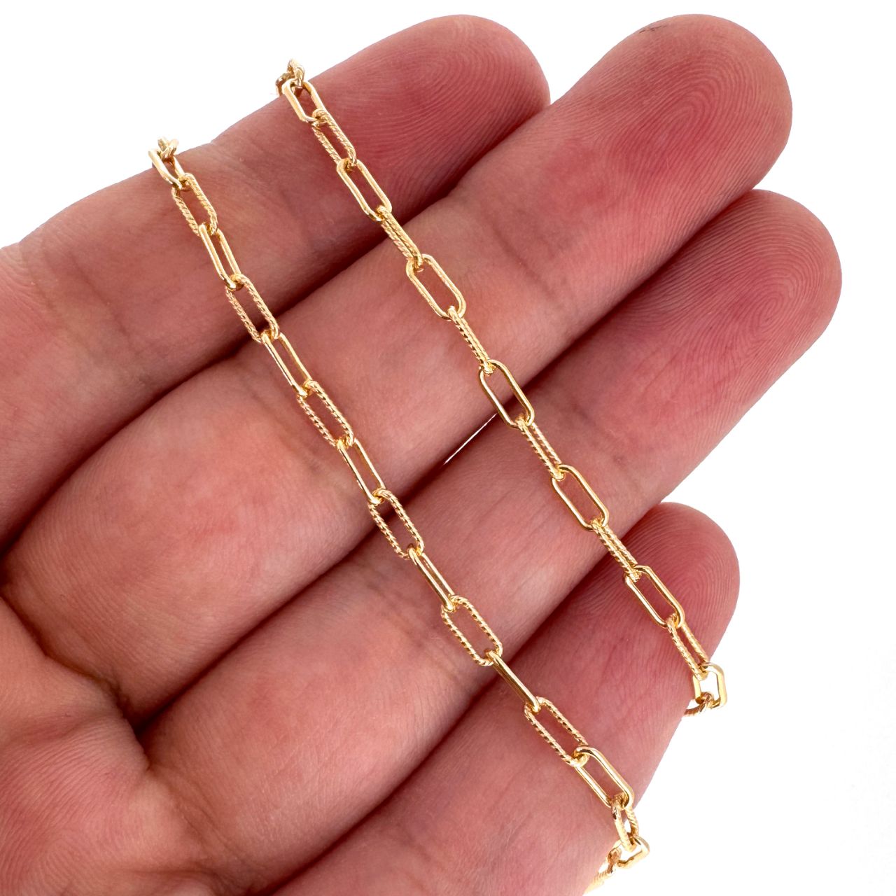 Custom wishlist OK Add to wishlist Add to compare list 925 Sterling Silver Bulk Chain - 5.5x2.5mm 1+1 Textured Rectangle Box Paperclip Chain (sold per foot) SKU : 101132 6 links per inch From $11.60 Add to cart