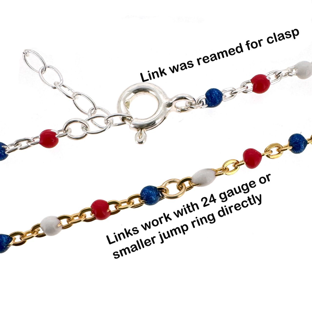 Custom wishlist OK Add to wishlist Add to compare list 925 Sterling Silver Cable Chain with Red, White, and Blue Enamel Links - Bulk Chain by the Foot SKU : 101116 Cable chain 1.8mm long by 1.2mm wide links 20 links per inch, including 5 enamel From $12.13 Add to cart