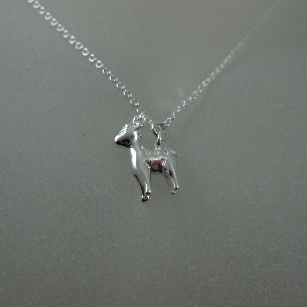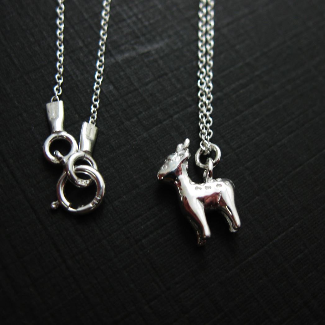 Price: per 1 necklaceMaterial: Solid Genuine .925 Sterling Silver. Description: : Reindeer charm, with great detail. Textured on both sides. Tiny plain cable link chain.Length: 16 to 24 inches. If you would like a different length please contact the seller. Charm Measurement: 12mm long, 8mm wide and 3 mm thick