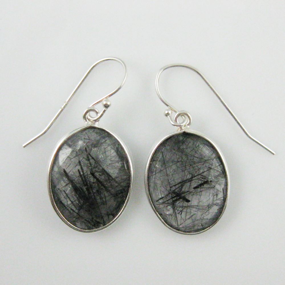 Bezel Gem Oval Pendant Necklace & Earrings - Sterling Silver-Black Rutilated Quartz (16-24")