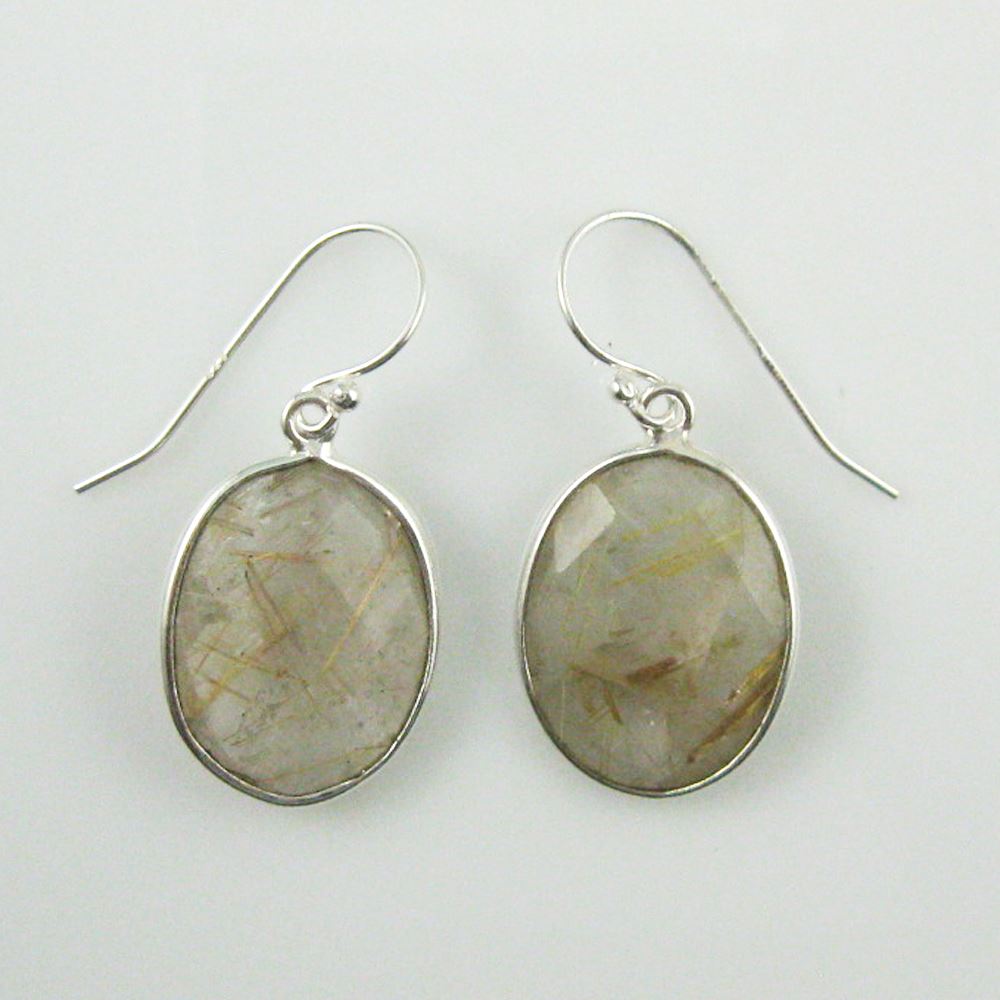 Bezel Gem Oval Pendant Necklace & Earrings - Sterling Silver-Gold Rutilated Quartz (16-24")