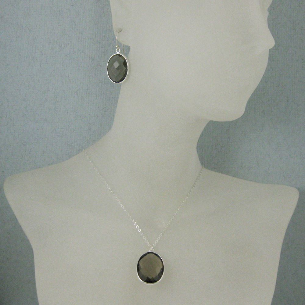 Bezel Gem Oval Pendant Necklace & Earrings - Sterling Silver-Smoky Quartz (16-24")