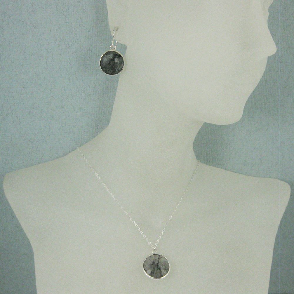 Bezel Gem Round Pendant Necklace & Earrings-Sterling Silver-Black Rutilated Quartz (16-24")