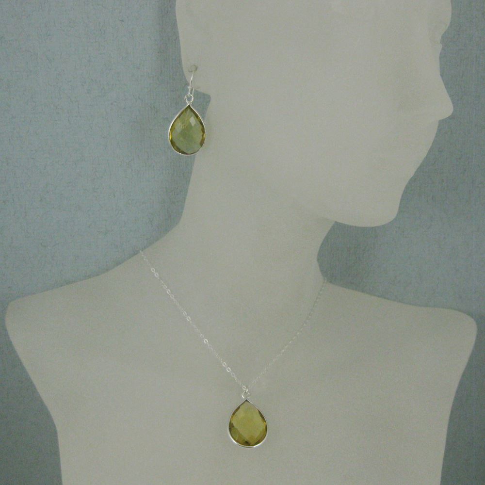 Bezel Gem Tear Pendant Necklace & Earrings - Sterling Silver-Lemon Quartz (16-24")