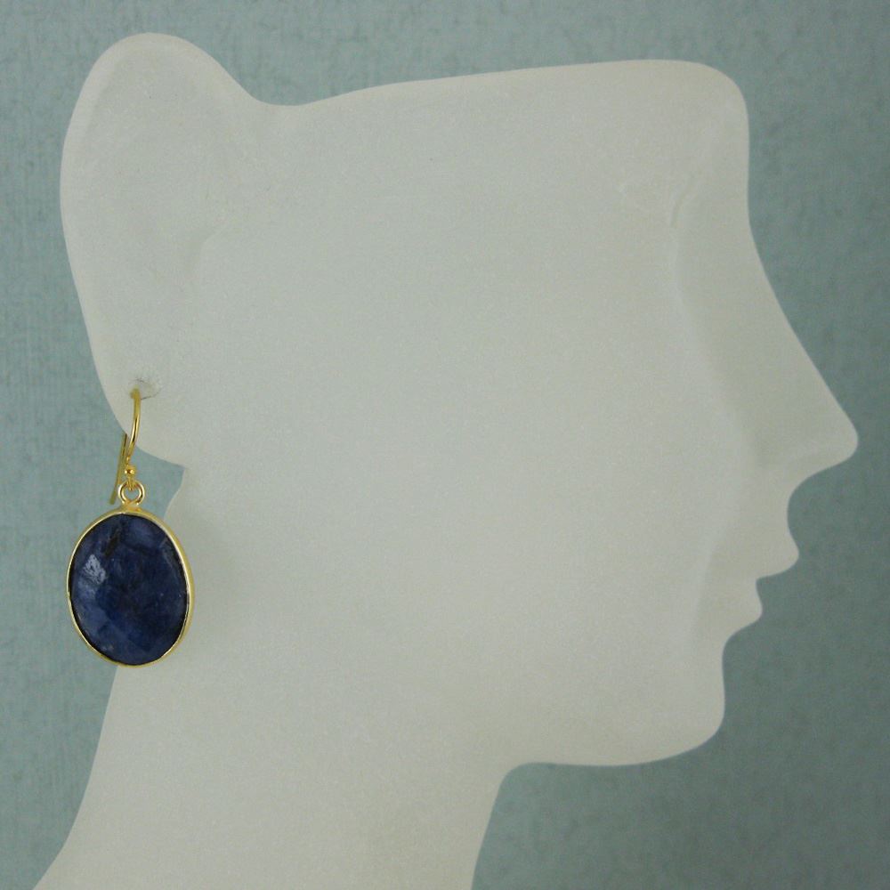 Bezel Gemstone Oval Pendant Earrings - Gold Plated Hooks - Blue Sapphire Dyed