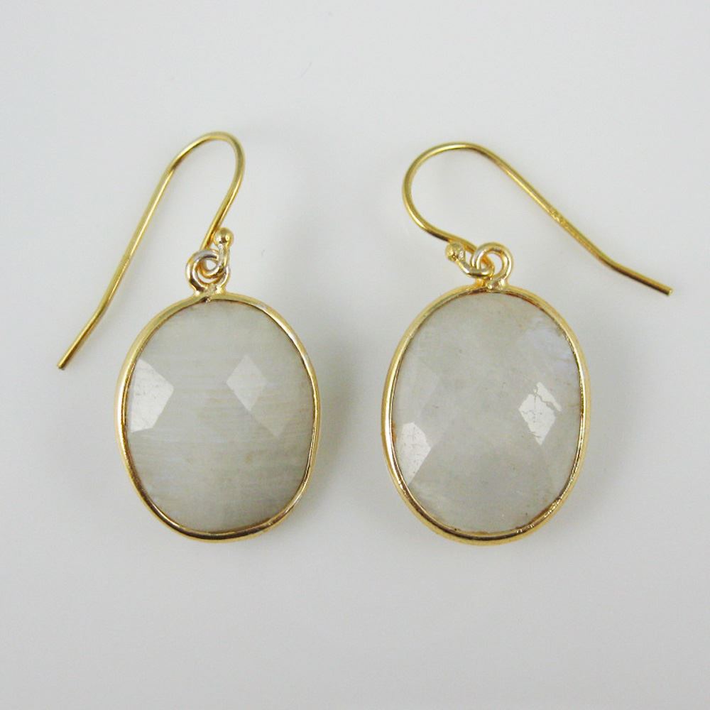 Bezel Gemstone Oval Pendant Earrings - Gold Plated Hooks - Moonstone
