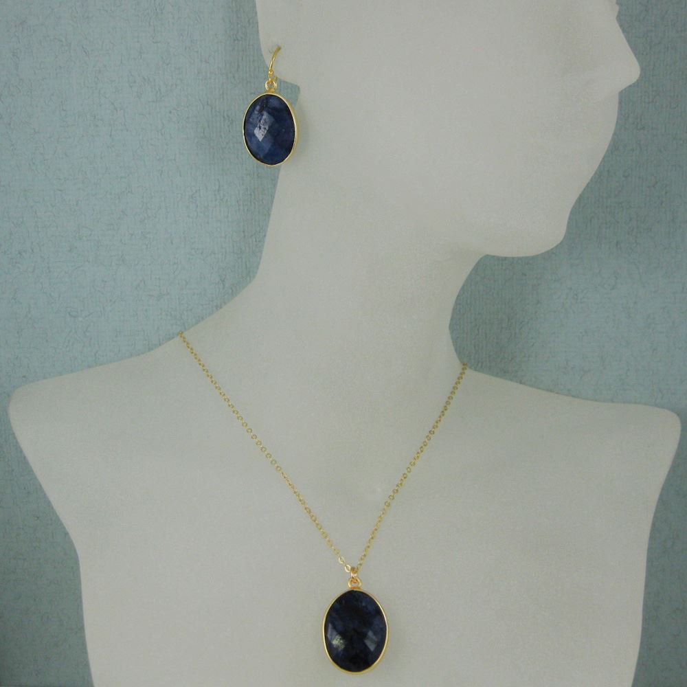 Bezel Gemstone Oval Pendant Necklace & Earrings-Gold Plated-Blue Sapphire Dyed (16-24")