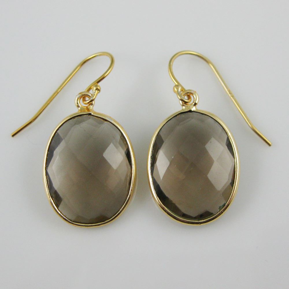 Bezel Gemstone Oval Pendant Necklace & Earrings-Gold Plated-Smoky Quartz (16-24")
