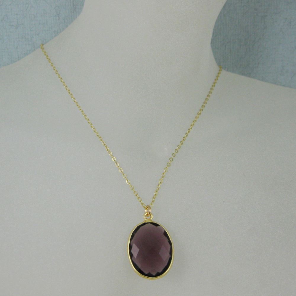 Bezel Gemstone Oval Pendant Necklace - Gold Plated Chain - Amethyst (16-24")