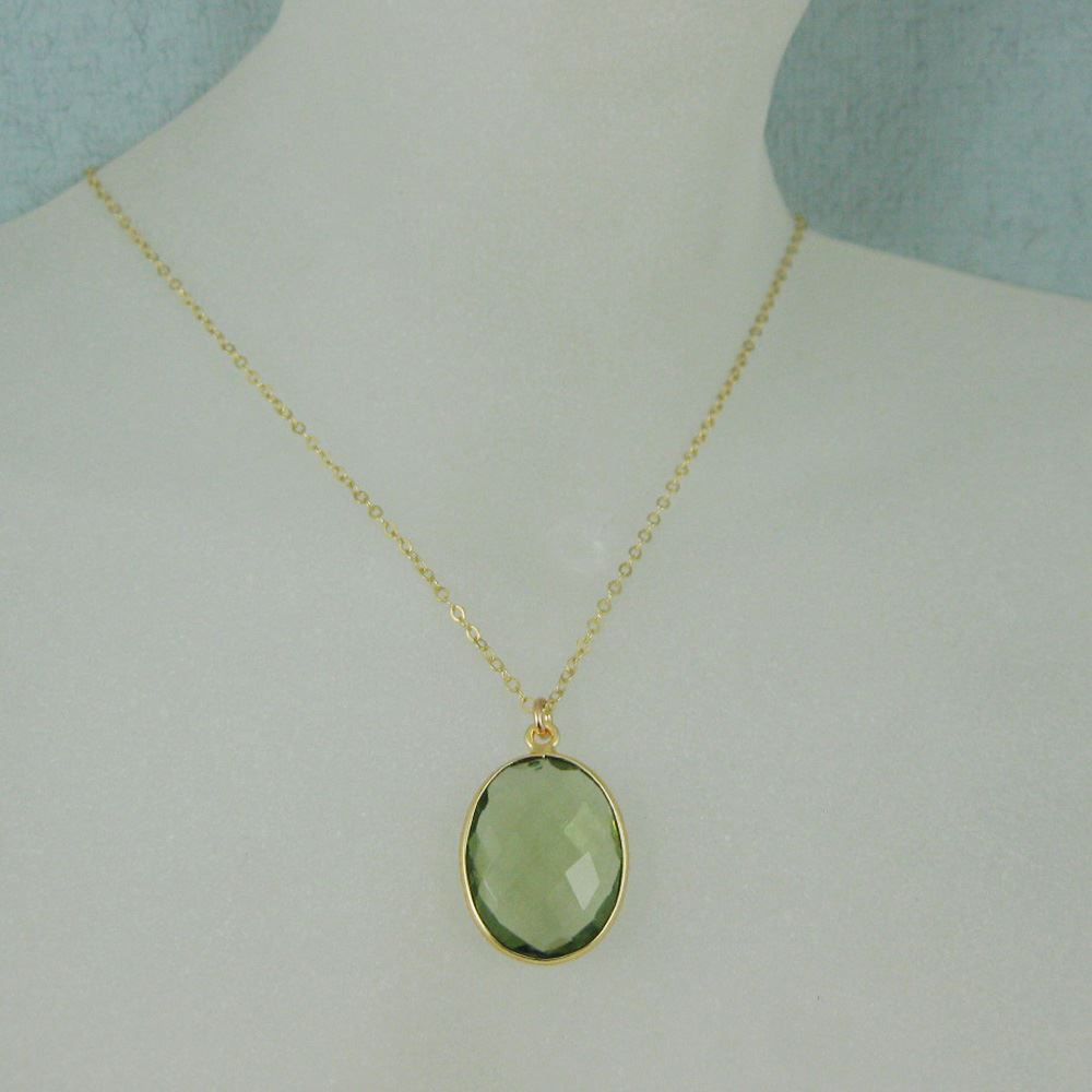 Bezel Gemstone Oval Pendant Necklace - Gold Plated Chain - Green Amethyst Quartz (16-24")