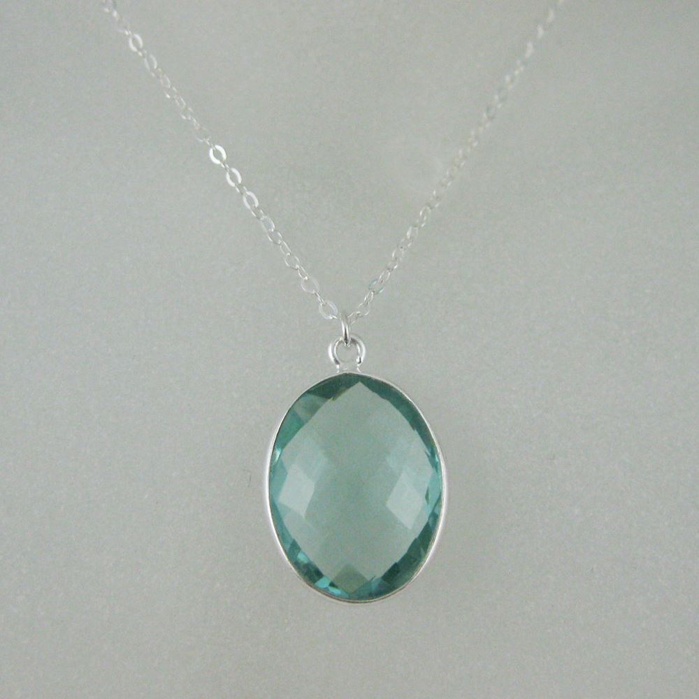 Bezel Gemstone Oval Pendant Necklace - Silver Sterling Chain - Aqua Quartz (16-24")