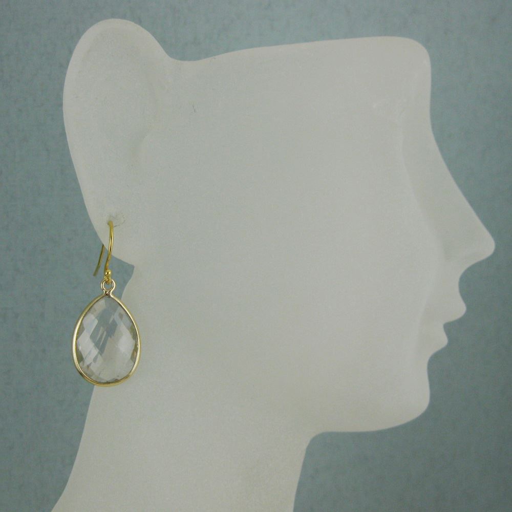 Bezel Gemstone Tear Pendant Earrings - Gold Plated Hooks - Crystal Quartz