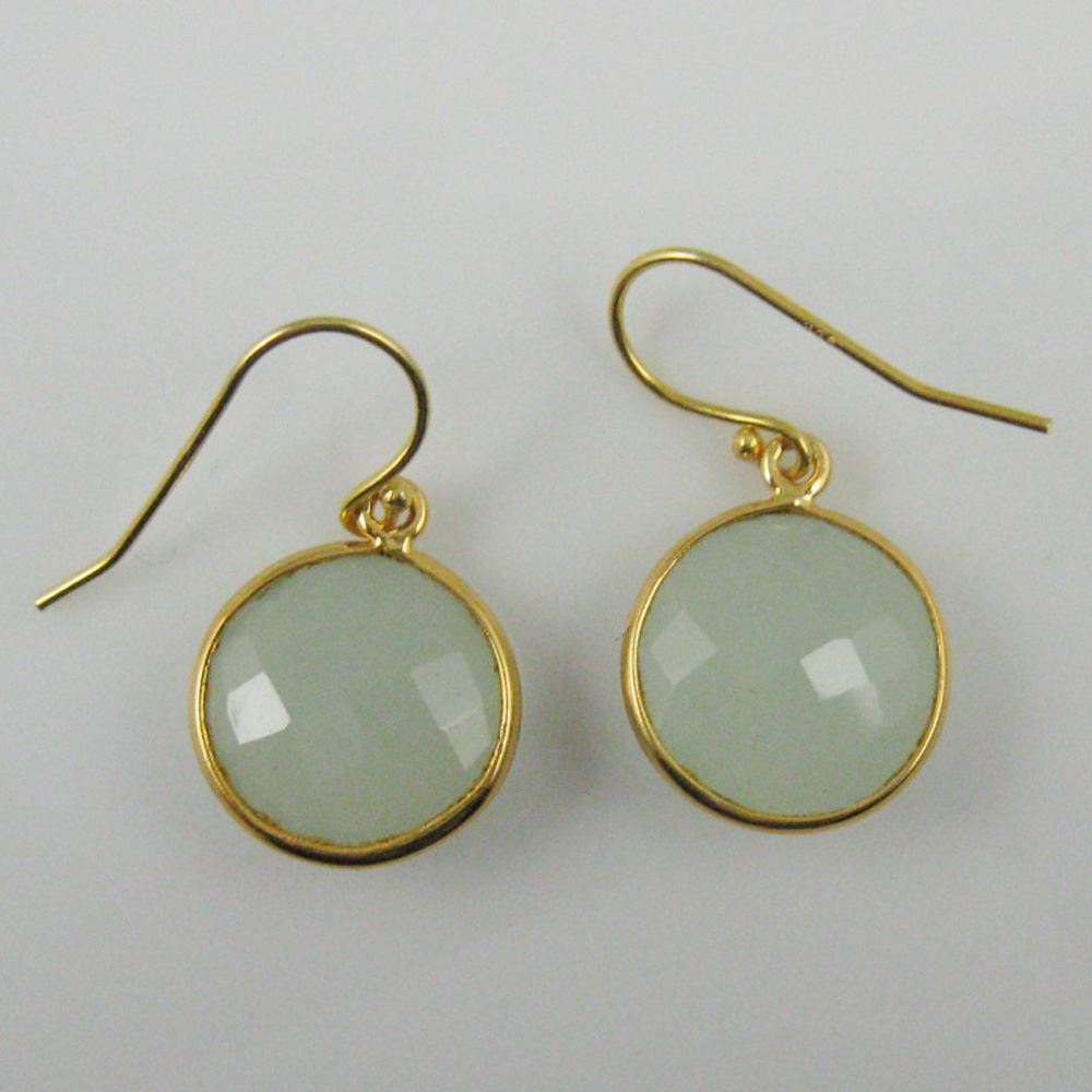Bezel Gemstone Round Pendant Earrings - Gold Plated Hooks - Aqua Chalcedony