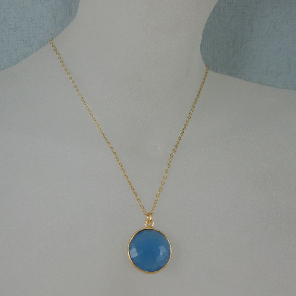 Bezel Gemstone Round Pendant Necklace - Gold Plated Chain - Blue Chalcedony (16-24")