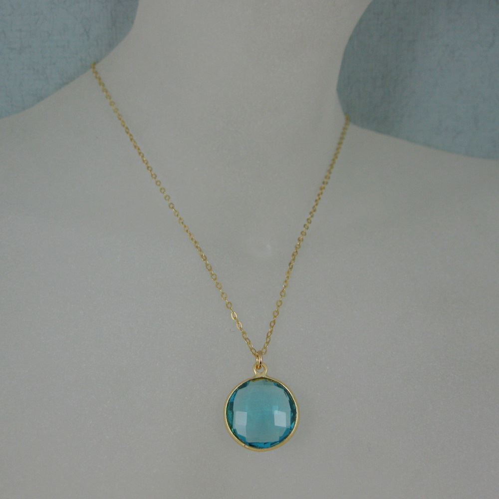 Stone: Blue QuartzChain and Frame Material: 18K Gold Plated Over Solid Genuine .925 Sterling Silver. Stone Shape: Faceted coin shape on both sides. Pendant Measurement: 19mm long, stone is 14mm. Chain Length: 16 to 24 inches. If you would like a different length please contact the seller.