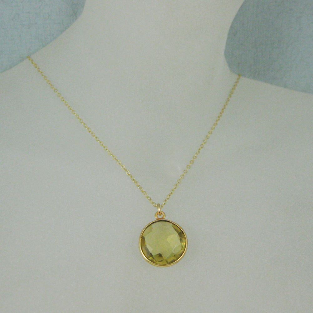 Stone: Lemon QuartzChain and Frame Material: 18K Gold Plated Over Solid Genuine .925 Sterling Silver. Stone Shape: Faceted coin shape on both sides. Pendant Measurement: 19mm long, stone is 14mm. Chain Length: 16 to 24 inches. If you would like a different length please contact the seller.