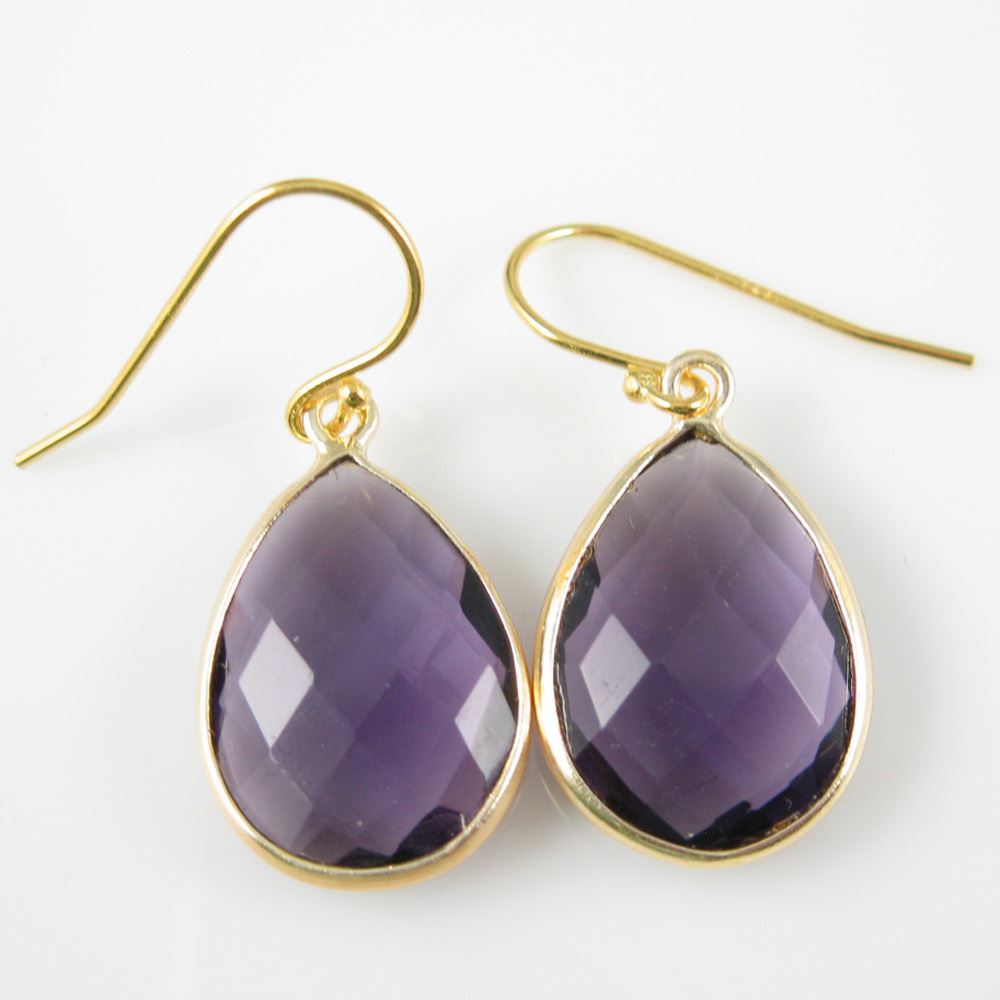 Bezel Gemstone Tear Pendant Necklace & Earrings - Gold Plated - Amethyst (16-24")