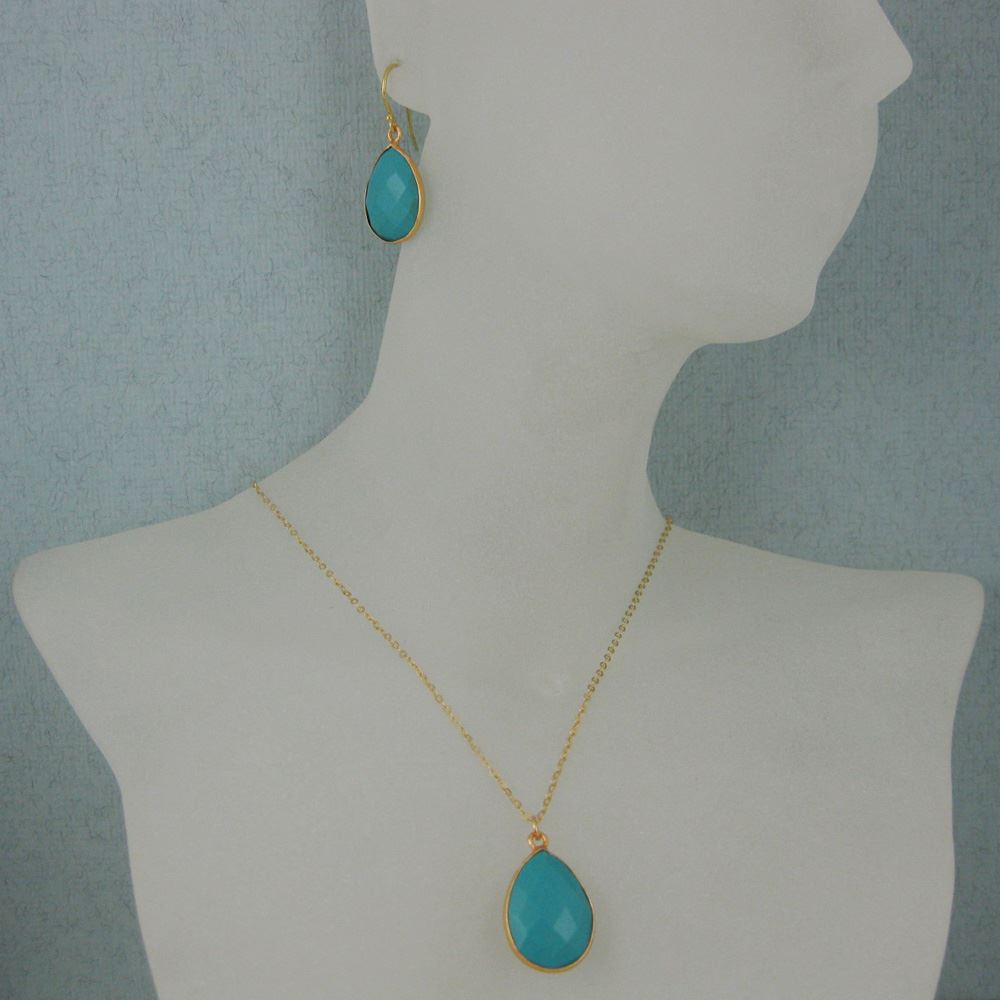 Bezel Gemstone Tear Pendant Necklace & Earrings - Gold Plated - Turquoise (16-24")