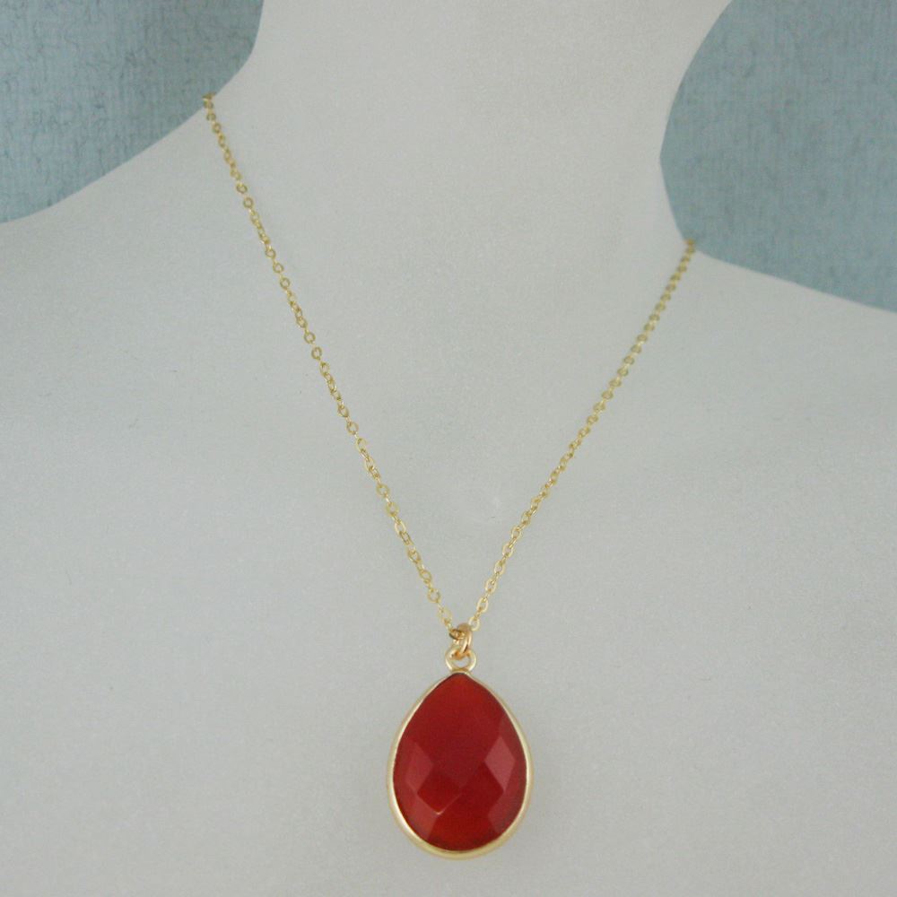 Bezel Gemstone Tear Pendant Necklace - Gold Plated Chain - Carnelian (16 - 24 inch)