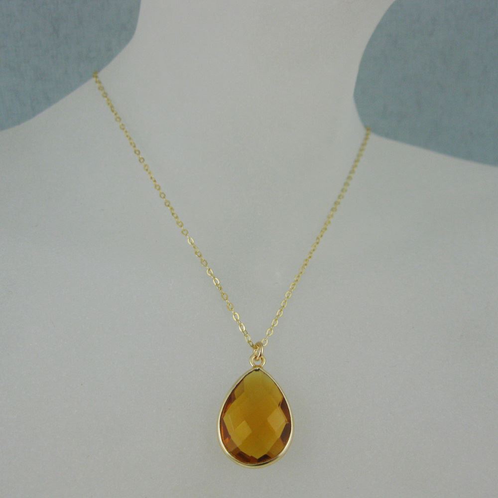 Bezel Gemstone Tear Pendant Necklace - Gold Plated Chain - Citrine Quartz (16 - 24 inch)