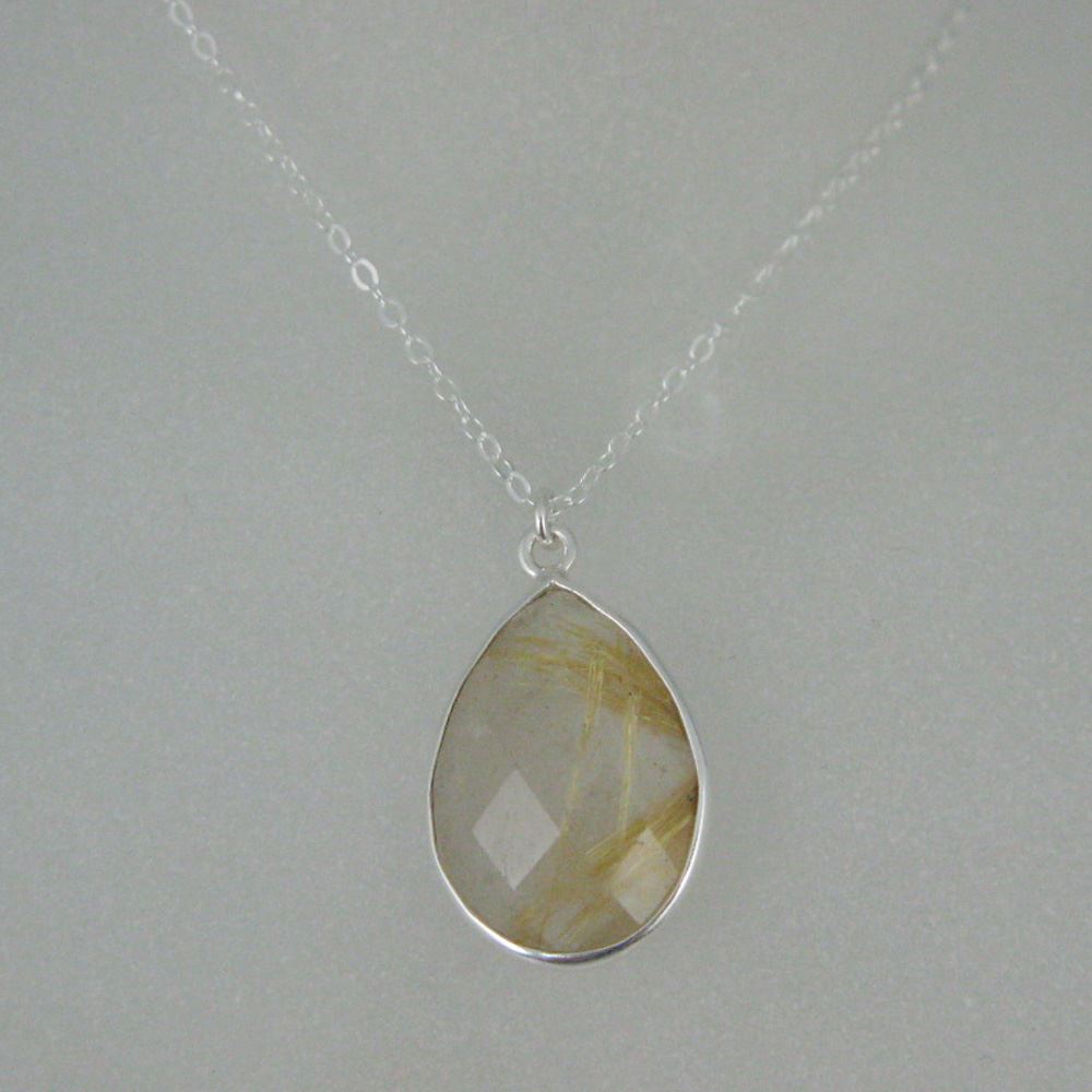 Stone: Gold Rutilated QuartzStone Shape: Faceted pear shape on both sides. Pendant Measurement: 22mm long, stone is 13x18mm. Chain Length: 16 to 24 inches. If you would like a different length please contact the seller.