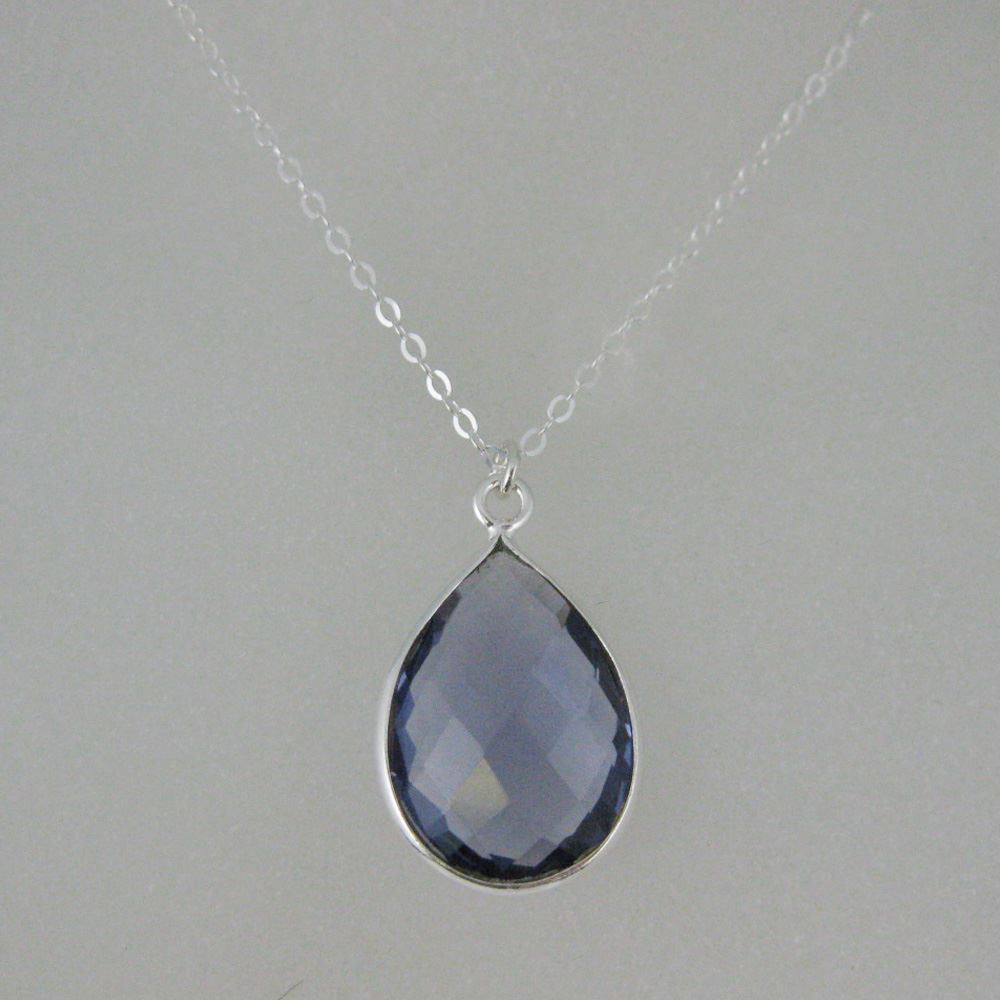 Stone: Iolite QuartzStone Shape: Faceted pear shape on both sides. Pendant Measurement: 22mm long, stone is 13x18mm. Chain Length: 16 to 24 inches. If you would like a different length please contact the seller