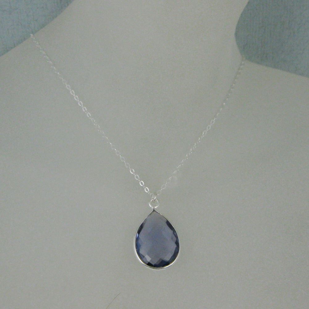 Bezel Gemstone Tear Pendant Necklace - Silver Sterling Chain - Iolite Quartz (16-24")