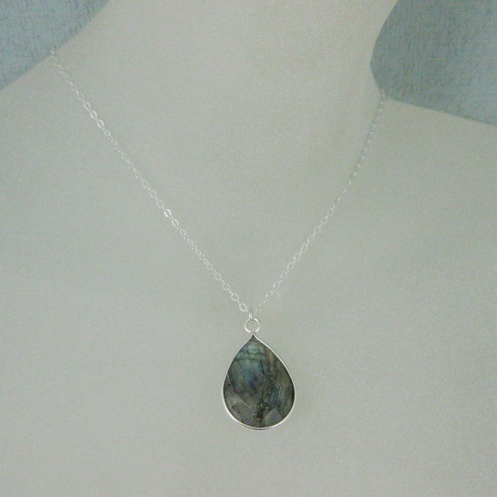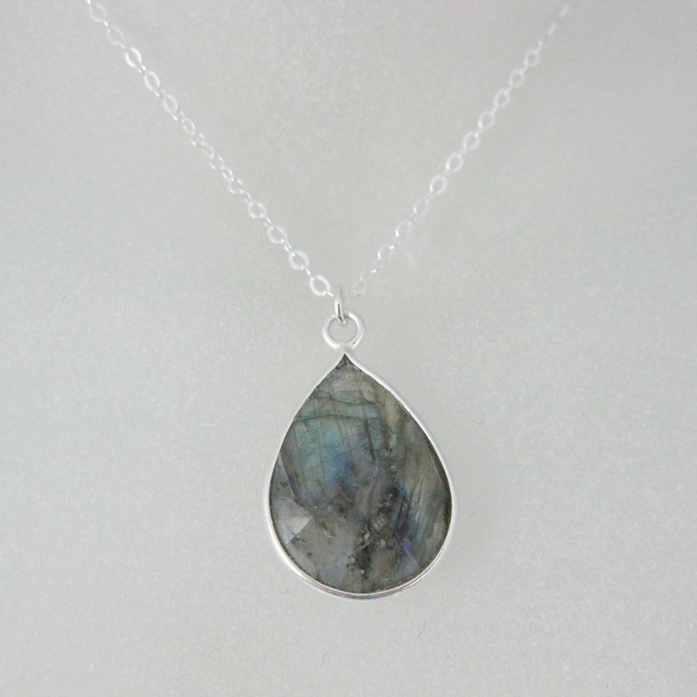 Bezel Gemstone Tear Pendant Necklace - Silver Sterling Chain - Labradorite (16-24")
