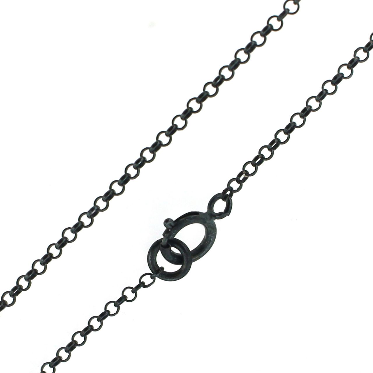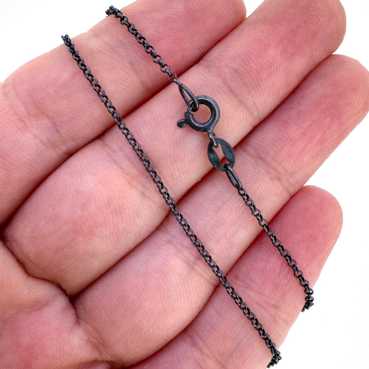 Custom wishlist OK Add to wishlist Add to compare list Oxidized Sterling Silver Finished Jewelry Chain - 2mm Rolo Chain SKU : 601005-OX Lengths: 16" - 36", 2mm rolo links $14.00 Add to cart