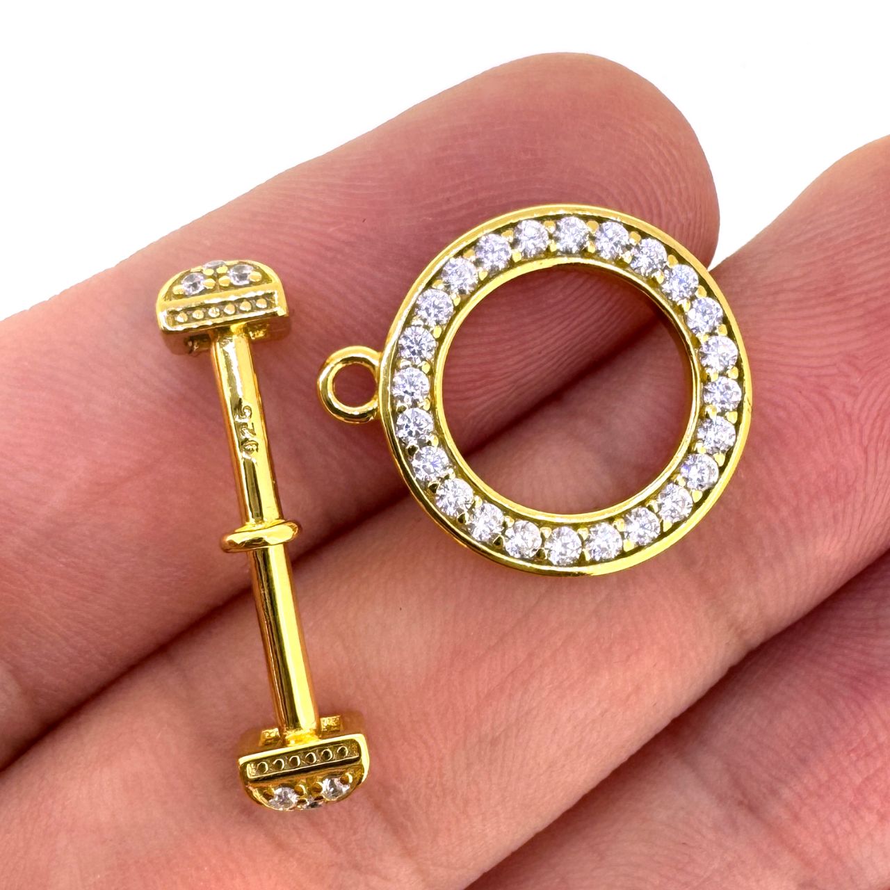 Material: Gold Over Solid Genuine .925 Sterling Silver ,with special anti-tarnish plating, the gold color can last for years with normal wearShape: Round CZ Toggle and Bar - 24 pcs 1mm CZ Stones in Hoop; 12 Stones on either end of the bar.Measurement: Bar is 21mm; Hoop is approximately 17.5mm with ring - 15mm without. Rings are 3mm Outer Diameter, 1.5mm ID.