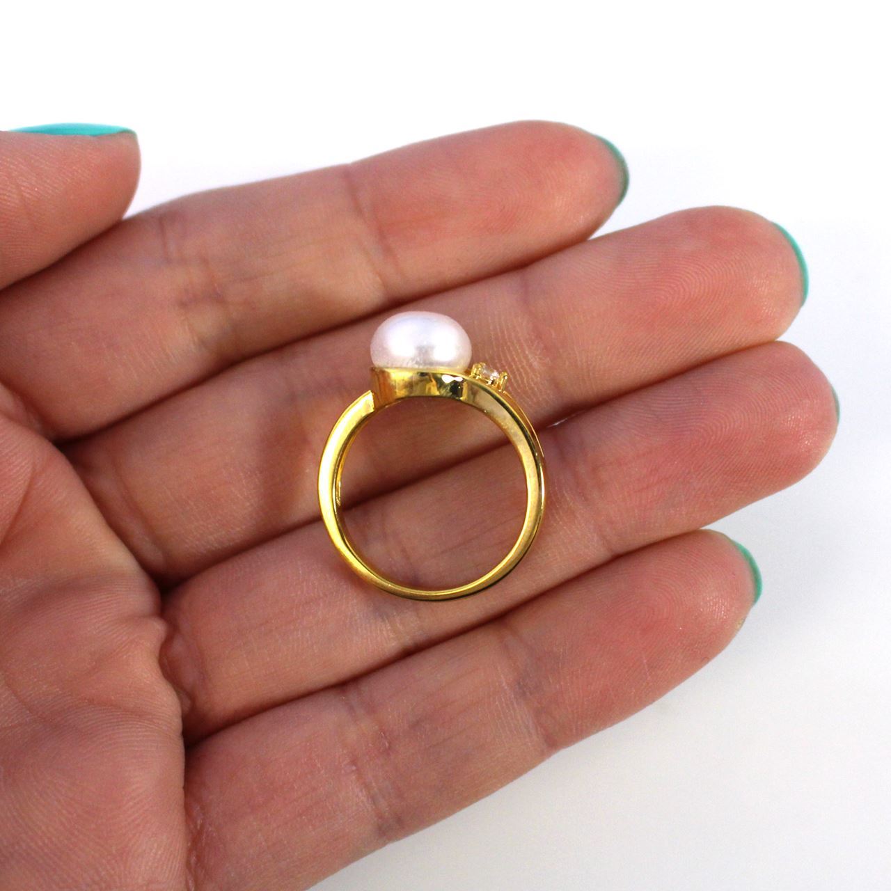 Material: Gold over 925 Solid Sterling Silver, CZ StoneStyle: Freshwater Pearl, CZ Stone RingPearl: Cultured White Freshwater Pearl 9mmMeasurement: Band is 2mm at smallest width, 3mm at widest spotRing Size: 7Quantity: Sold per piece