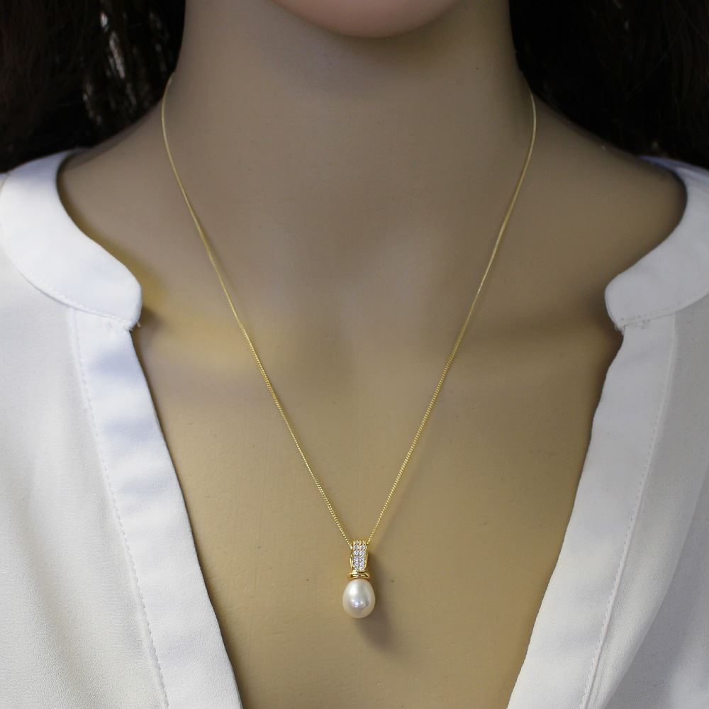 A teardrop shaped white freshwater pearl drops from a gold plated sterling silver and cz stone bail pendant on a delicate gold plated silver chain.