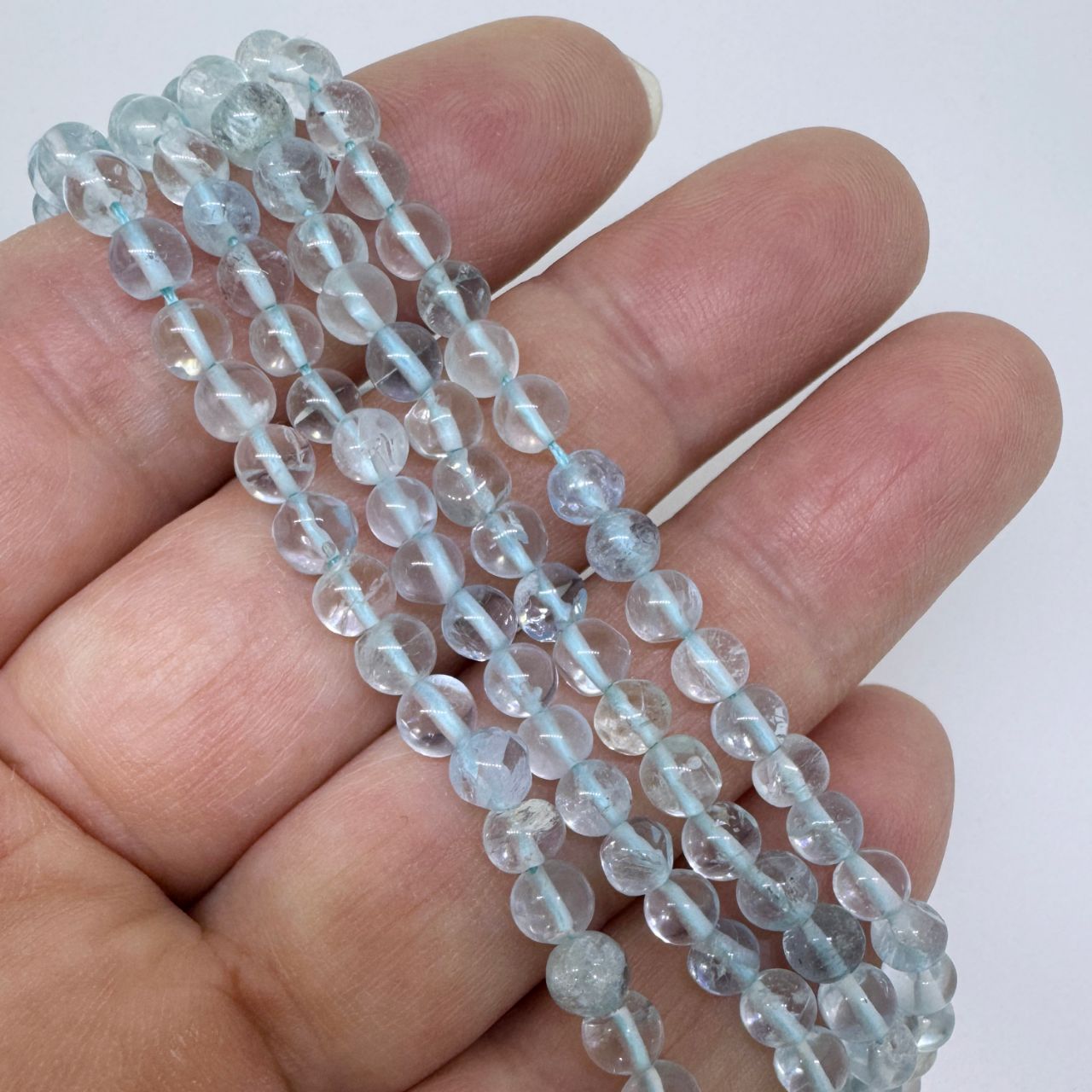 Gemstone Name: AquamarineShape: Hand cut smooth roundSize: 4mmLength: 14 Inch StrandNumber of Beads: About 90 Beads