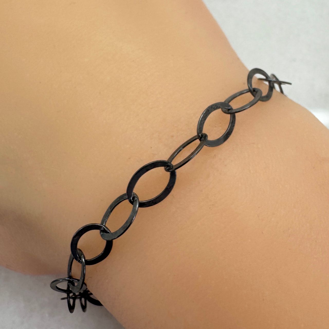 Custom wishlist OK Add to wishlist Add to compare list Oxidized 925 Italian Sterling Silver Finished Chain - Flat Cable Oval Chain SKU : 601010OX Shiny Dark Black Color Lengths: 7" - 36" $14.85 Add to cart