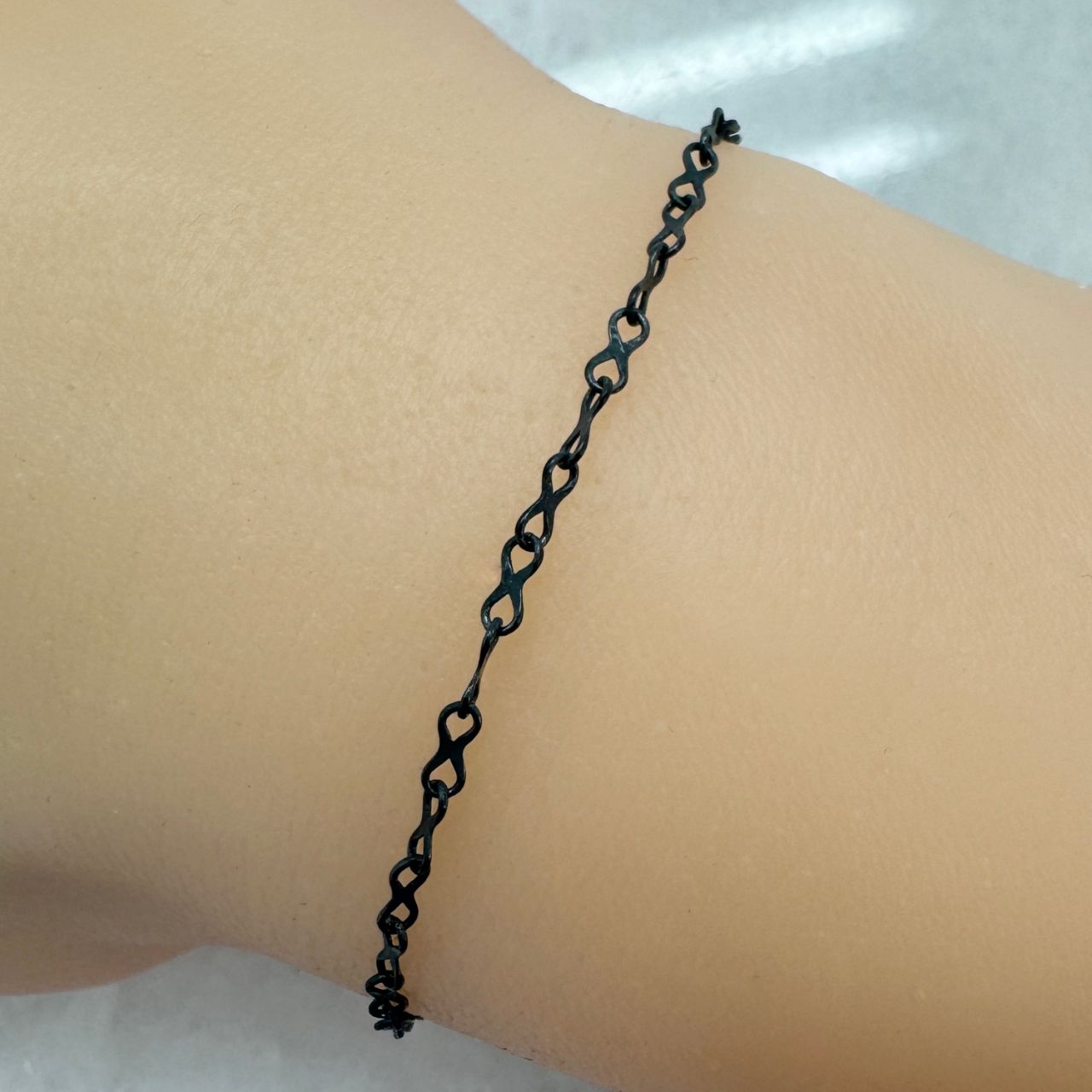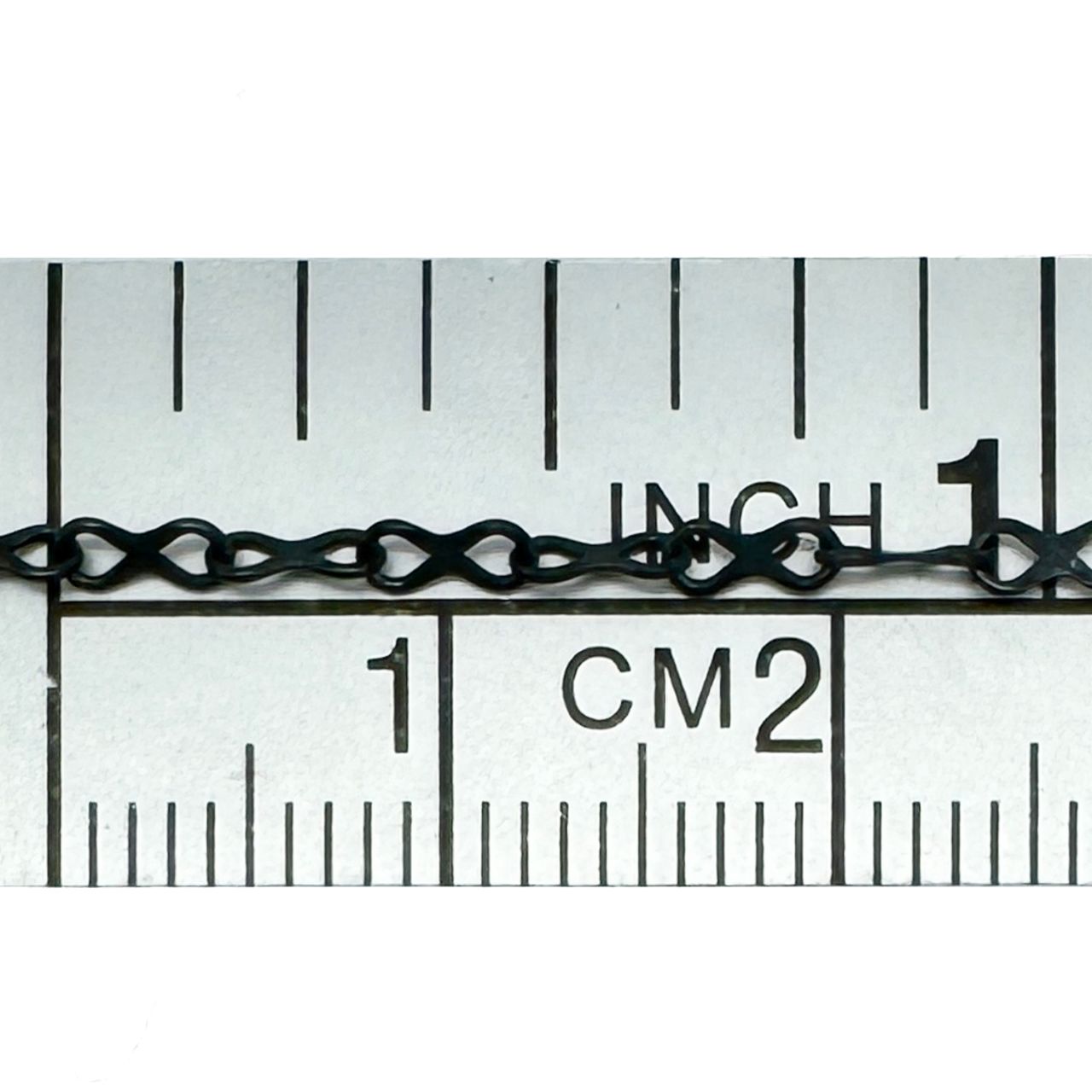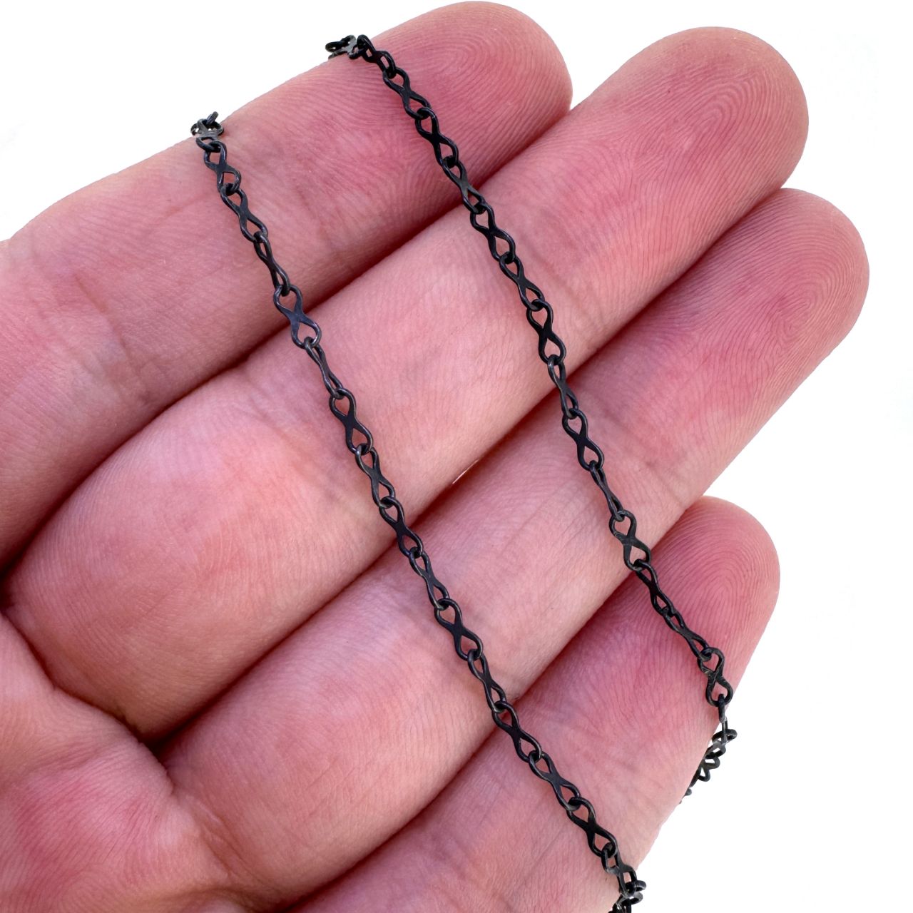 Custom wishlist OK Add to wishlist Add to compare list Oxidizied 925 Sterling Silver Bulk Chain - 5.3x2.8mm Sunburst Infinity Chain (sold per foot) SKU : 101127OX 5.5 links per inch Shiny Black Color From $11.15 Add to cart
