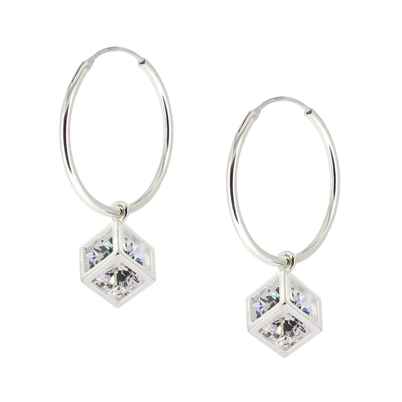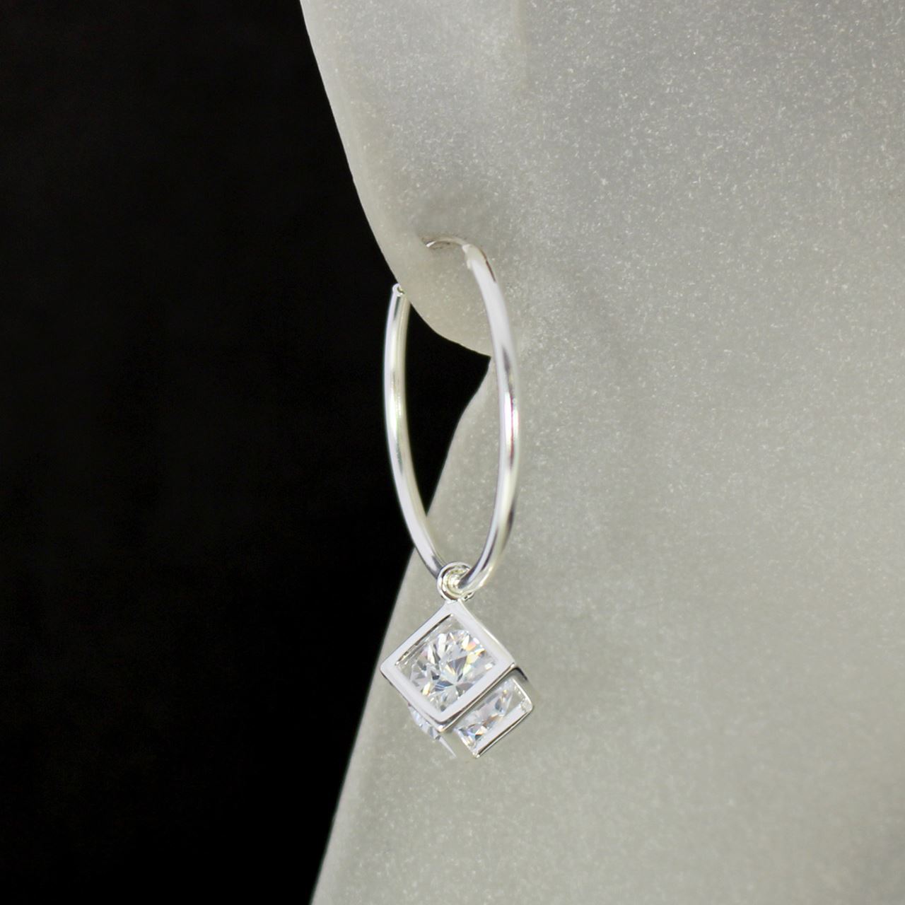 Sterling Silver CZ Stone Cube Charm Hoop Earrings (Sold Per Pair)