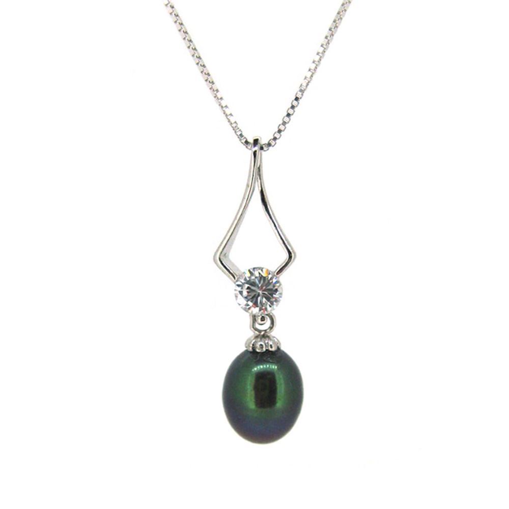 A peacock colored teardrop shaped freshwater pearl dangles below a sterling silver diamond shaped pendant with a 4mm cz stone. This necklace is the perfect accessory for any bridal party or the perfect birthday gift, especially for June birthdays.