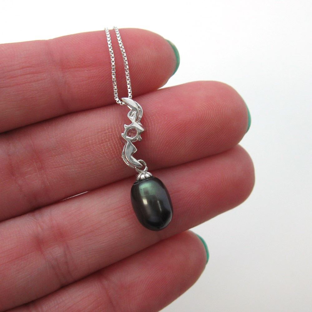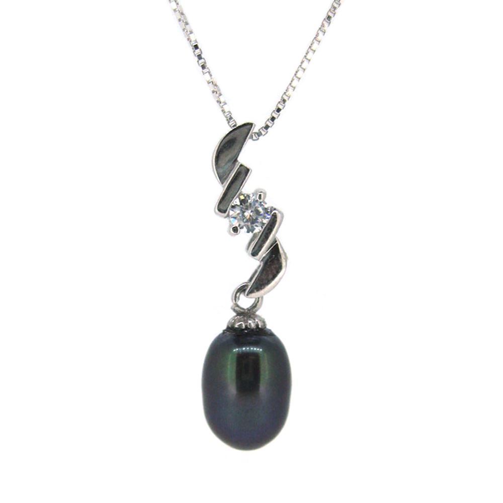 A peacock teardrop shaped freshwater pearl dangles below a sterling silver zigzag pendant with a cz stone in the center. This necklace is the perfect accessory for any bridal party or the perfect birthday gift, especially for June birthdays.