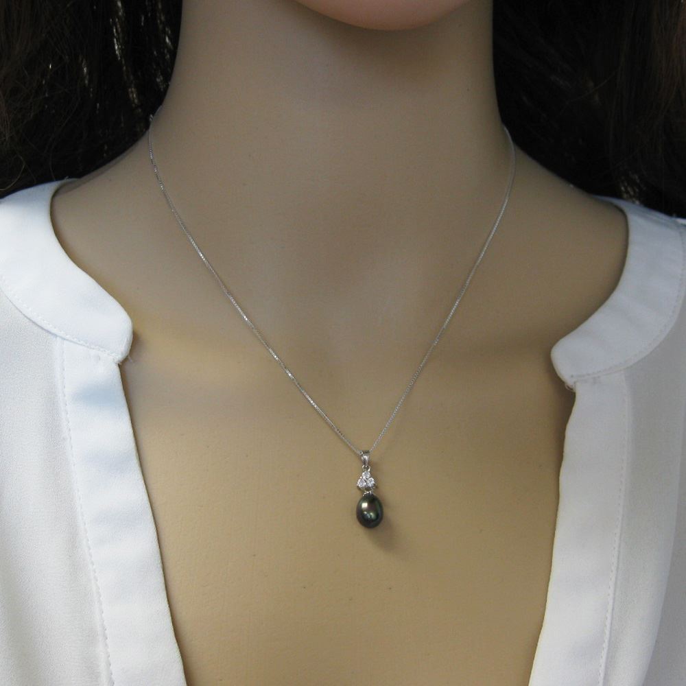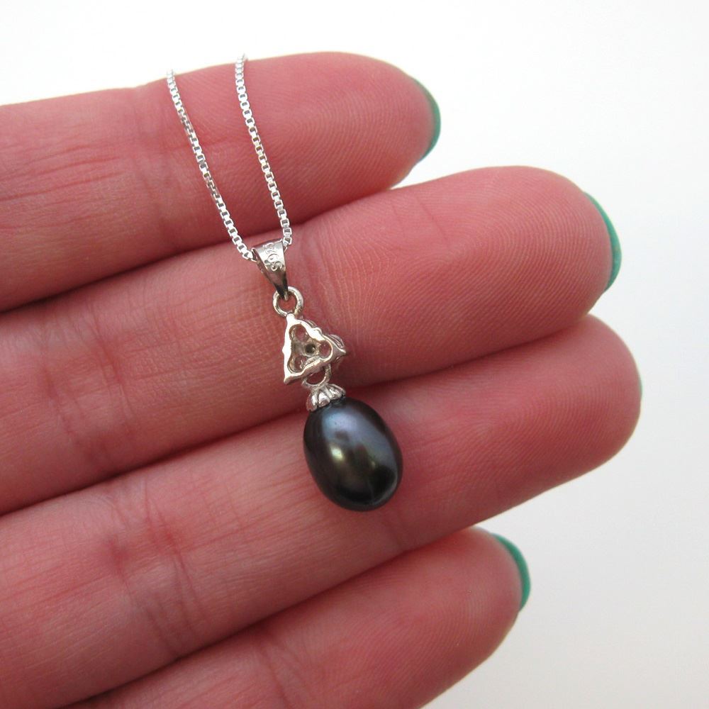 A teardrop peacock freshwater pearl dangles below a sterling silver and cz stone triangle pendant. This necklace is the perfect accessory for any bridal party or the perfect birthday gift, especially for June birthdays.