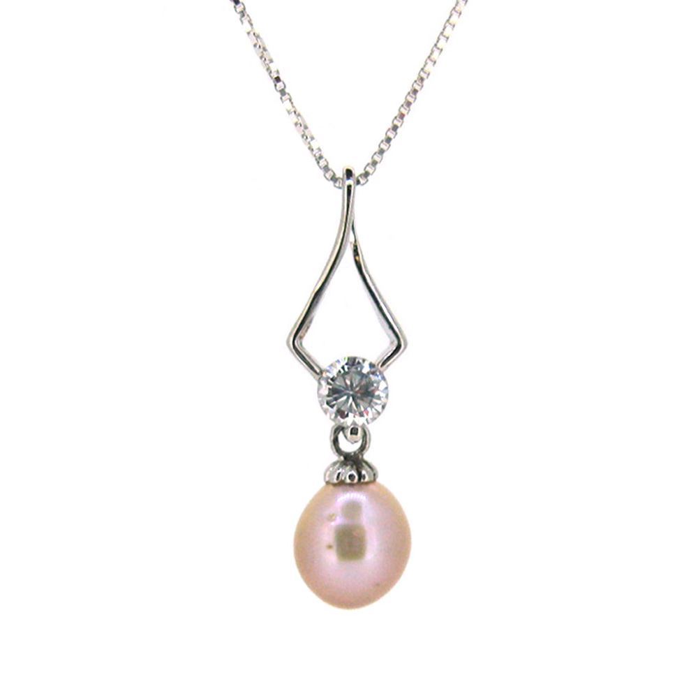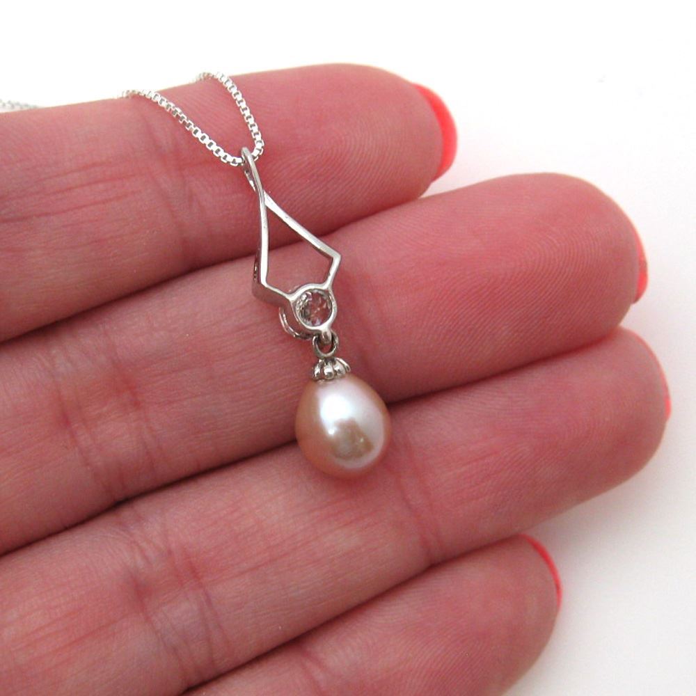 A pink teardrop shaped freshwater pearl dangles below a sterling silver diamond shaped pendant with a 4mm cz stone. This necklace is the perfect accessory for any bridal party or the perfect birthday gift, especially for June birthdays.