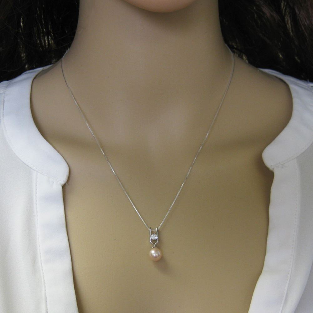 A pink teardrop shaped freshwater pearl dangles below a sterling silver pendant with a 3.5mm cz stone. This necklace is the perfect accessory for any bridal party or the perfect birthday gift, especially for June birthdays.