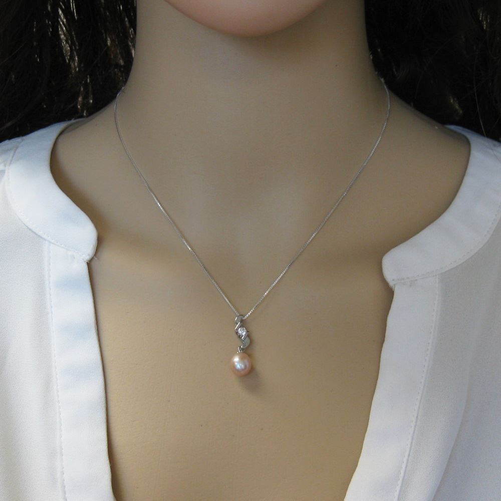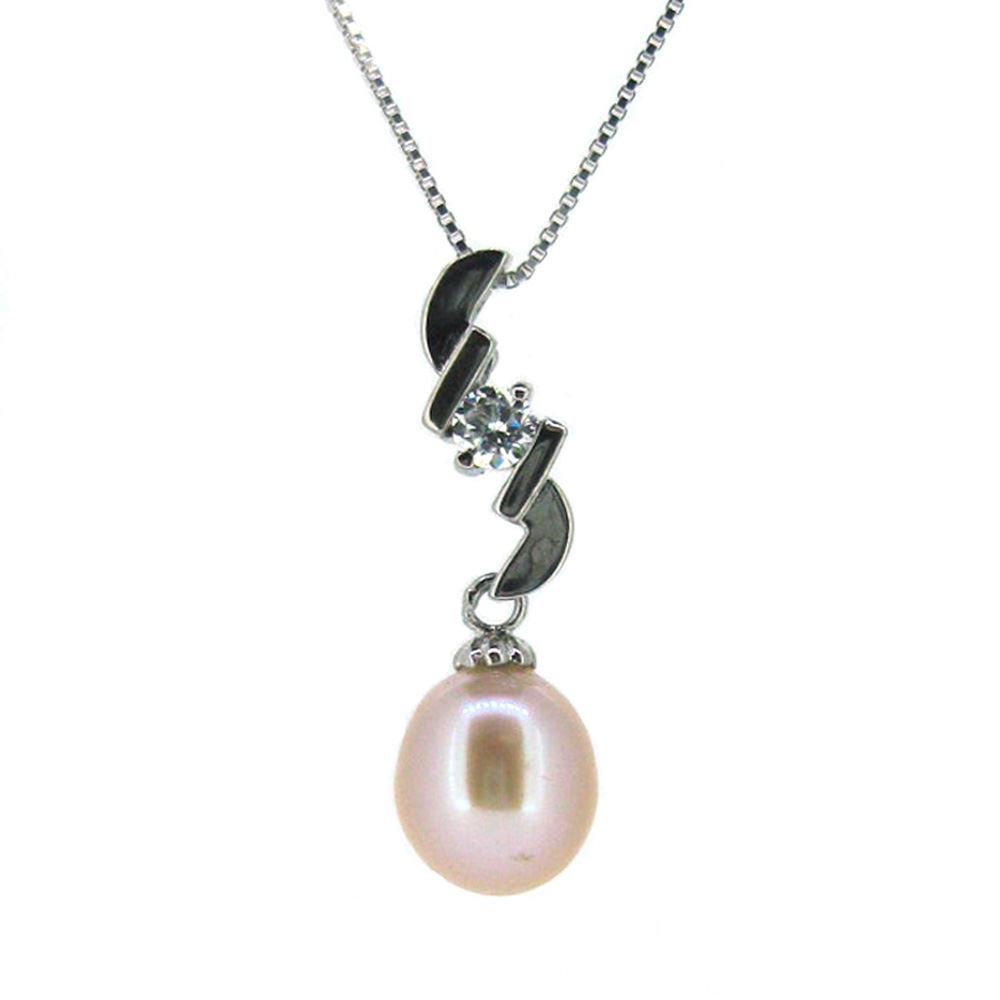 A pink teardrop shaped freshwater pearl dangles below a sterling silver zigzag pendant with a cz stone in the center. This necklace is the perfect accessory for any bridal party or the perfect birthday gift, especially for June birthdays.