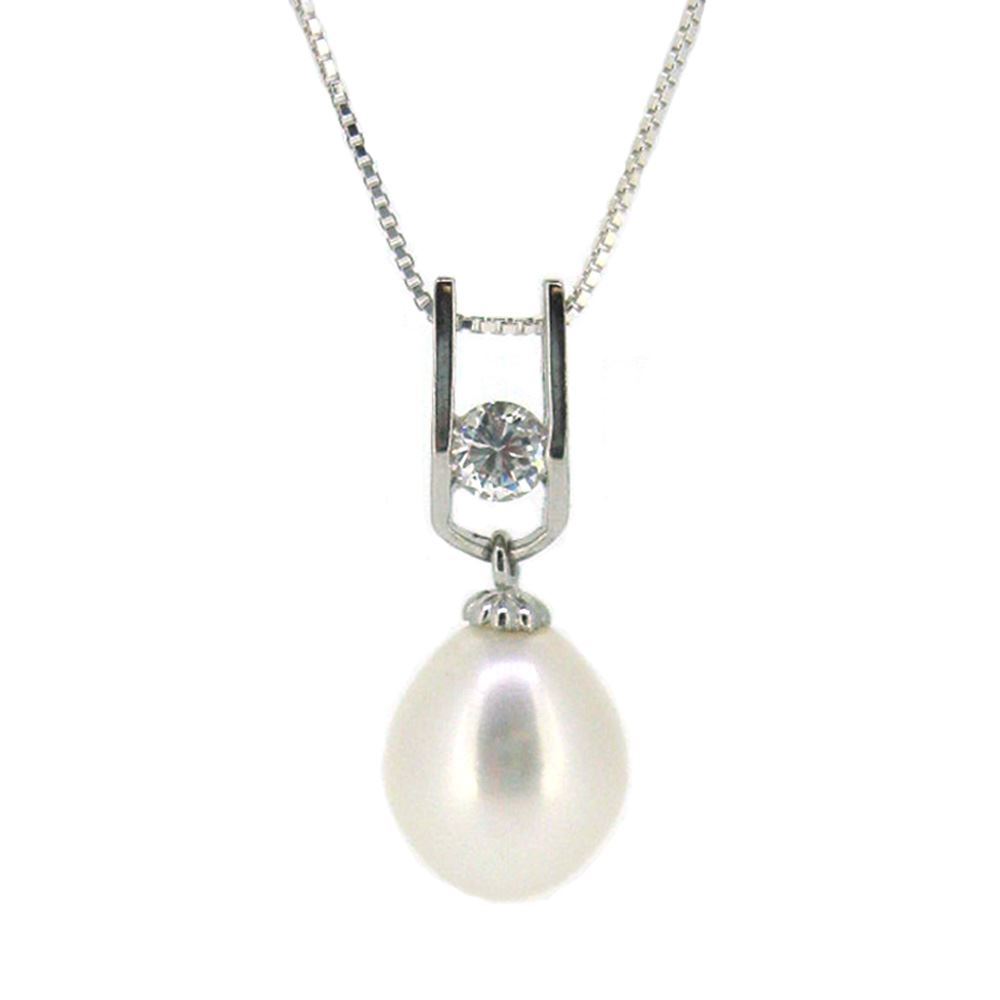 A white teardrop shaped freshwater pearl dangles below a sterling silver pendant with a 3.5mm cz stone. This necklace is the perfect accessory for any bridal party or the perfect birthday gift, especially for June birthdays.