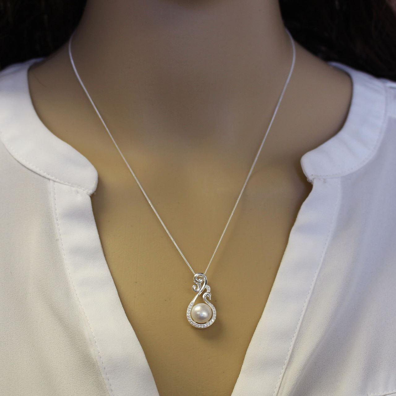 A white freshwater button pearl sits within a beautiful cz stone adorned sterling silver peacock pendant. This necklace is the perfect accessory for any bridal party or the perfect birthday gift, especially for June birthdays.