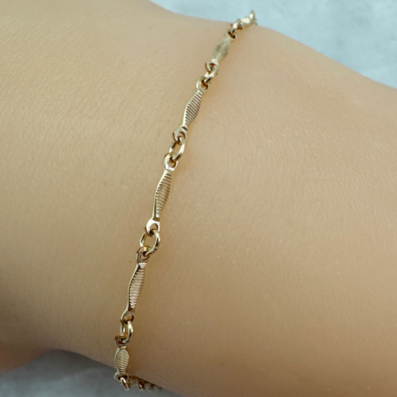 Best Seller Add to compare list 1/20 Gold Filled Bulk Chain - 1.3mm Dapped Bar Chain(Sold per foot) SKU : 101067GF 8.5mm x 1.3mm Bar 3 links and 2.5 bars per inch Log In for Wholesale Prices