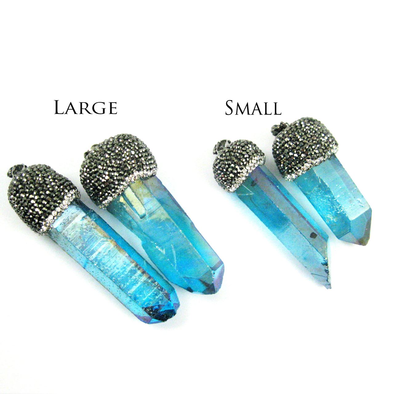 Stone: Blue Aura Quartz Titanium Crystal- Stone is raw organic nature stonePave: Stone top paveType: Pendulum PendantBail: Zircon pave over stainlenn steelShape: Pendulum style, long pendulum