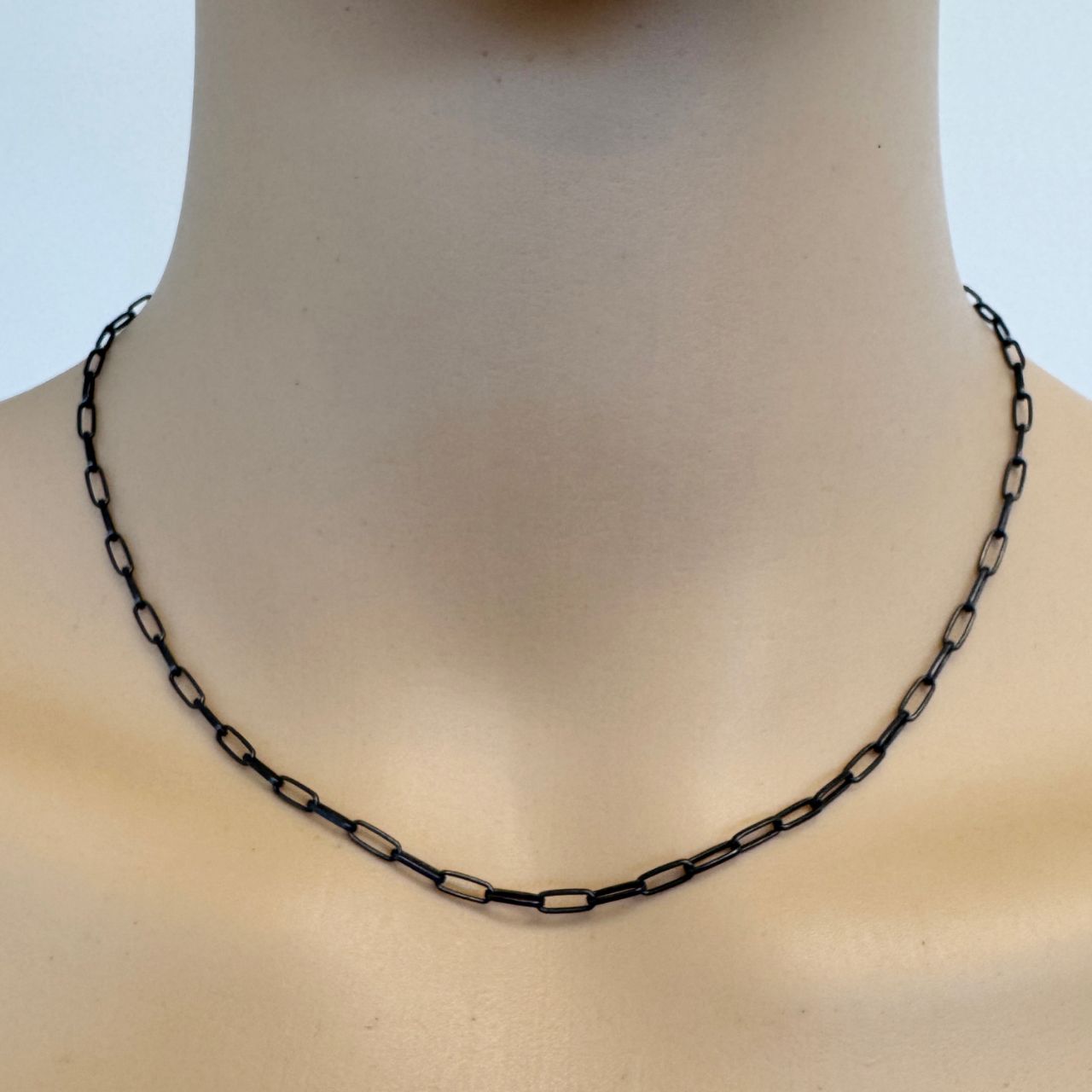 Custom wishlist OK Add to wishlist Add to compare list Oxidized 925 Sterling Silver Finished Rectangle Long Box Chain SKU : 601002-OX Lengths: 7"- 40" 2.5x6.2mm link Shiny Dark Black Color $11.75 Add to cart